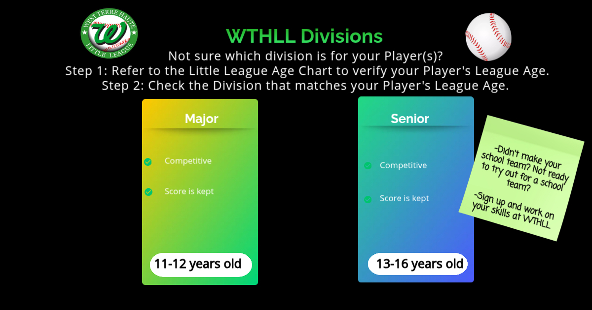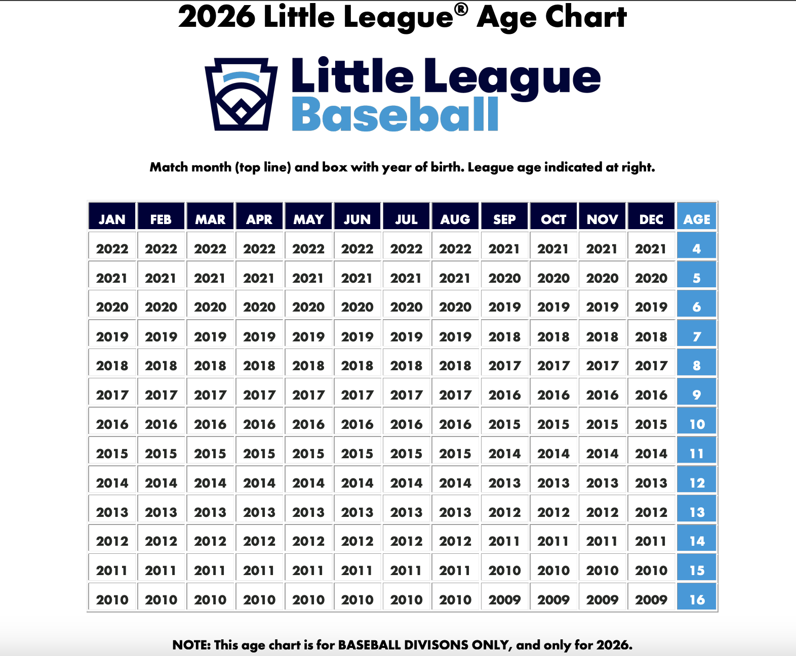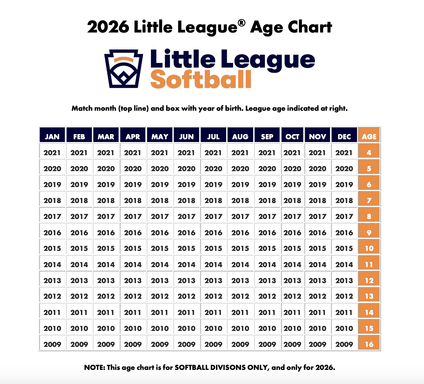 Baseball and Softball divisions utilize different age calendars for their respective sports. Please refer to the charts, below, to help determine a player's league age for the 2025 Spring and Fall seasons. You may also use the Little League International Age Calculator. For more information on the various placements/divisions for baseball and softball, please read through the Recreational Programs tab on this website.